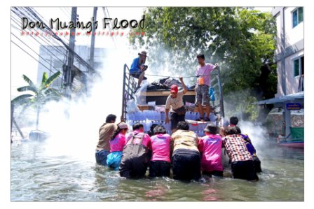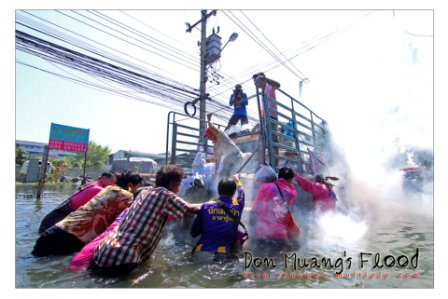 แต่แล้วระดับน้ำสูงท่วมท่อไอเสีย เลยต้องกลับรถ ขากลับออกมารถทำท่าจะดับ เลยต้องช่วยกันเข็น เมื่อท่อไอเสียเริ่มพ้นน้ำก็พ่นควันสีขาวคละคลุ้งไปทั่วเลย คนเข็น ชาวบ้านแตกกระเจิง ใครบางคนเลยแซวว่าพ่นยาไล่ยุงกันด้วยทีมนี้ วันนี้มีภาพประกอบเพราะรู้จักตากล้องประจำทีมแล้ว
