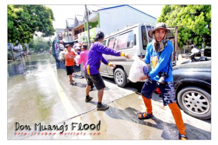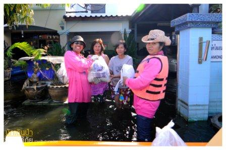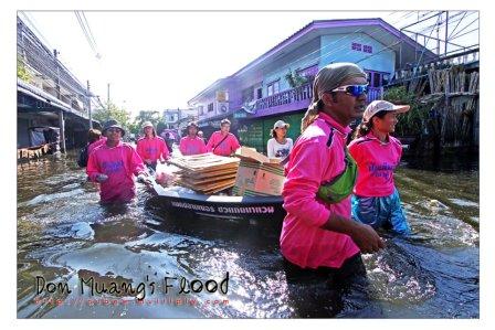 รอบแรกผมไม่ได้เข้าไปด้วยเพราะคนเยอะแล้ว เลยแจกข้าว กับข้าว และน้ำที่รถหกล้อให้กับผู้คนที่ผ่านไปมา มีชาวบ้านอาสาพายเรือเข้าไปส่งข้าวให้ชาวบ้านในซอยด้วย ซอยแคบมากเท่าลำเรือ กว่าจะกลับเรือออกมาได้ เล่นเอาลุ้น